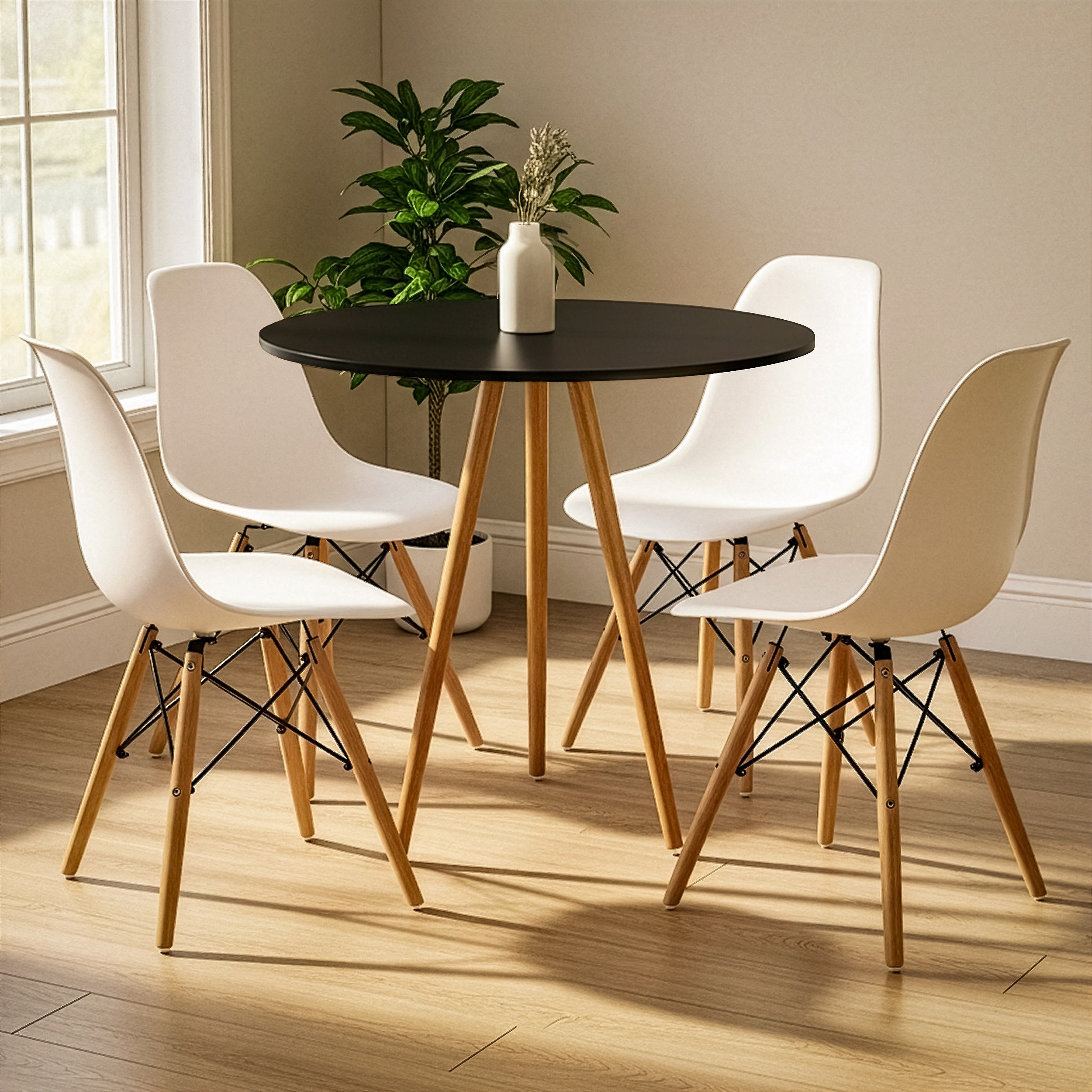 O conjunto Mesa Redonda Tripé com Cadeiras Charles Eames une design moderno e praticidade. Ideal para ambientes compactos, trazendo charme e funcionalidade ao ambiente.