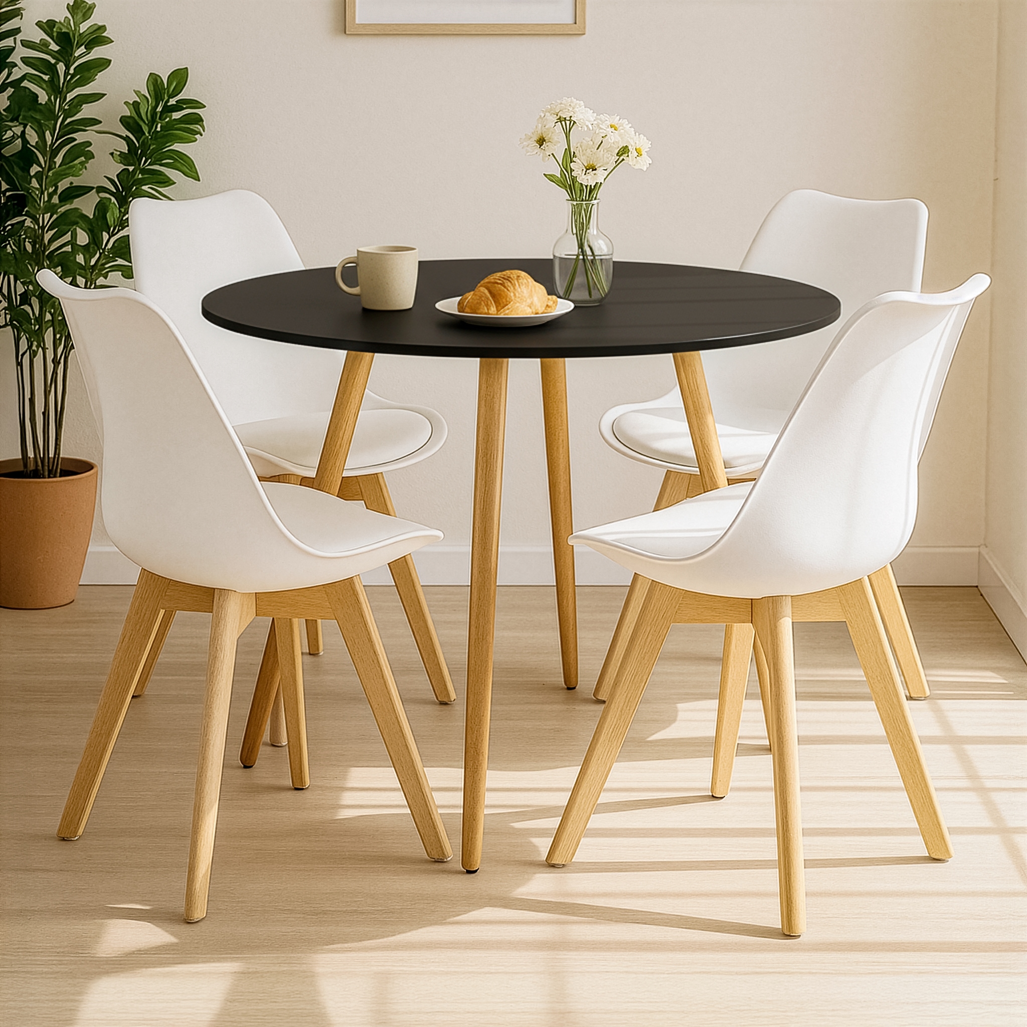 Mesa de Jantar Redonda Sofia 100cm Preta com 4 Cadeiras Siena Branca