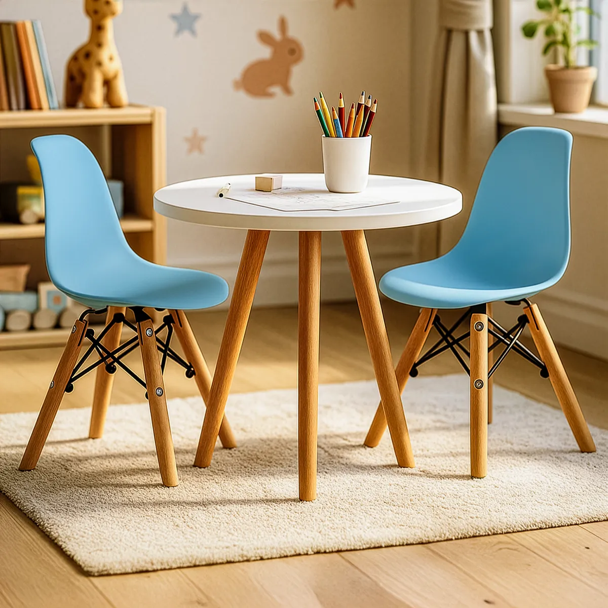 Procurando uma solução funcional e elegante para completar a área de recreação infantil? Não procure mais, nosso incrível pacote inclui uma linda mesa com pernas de madeira envernizada e duas cadeiras infantis Charles Eames.