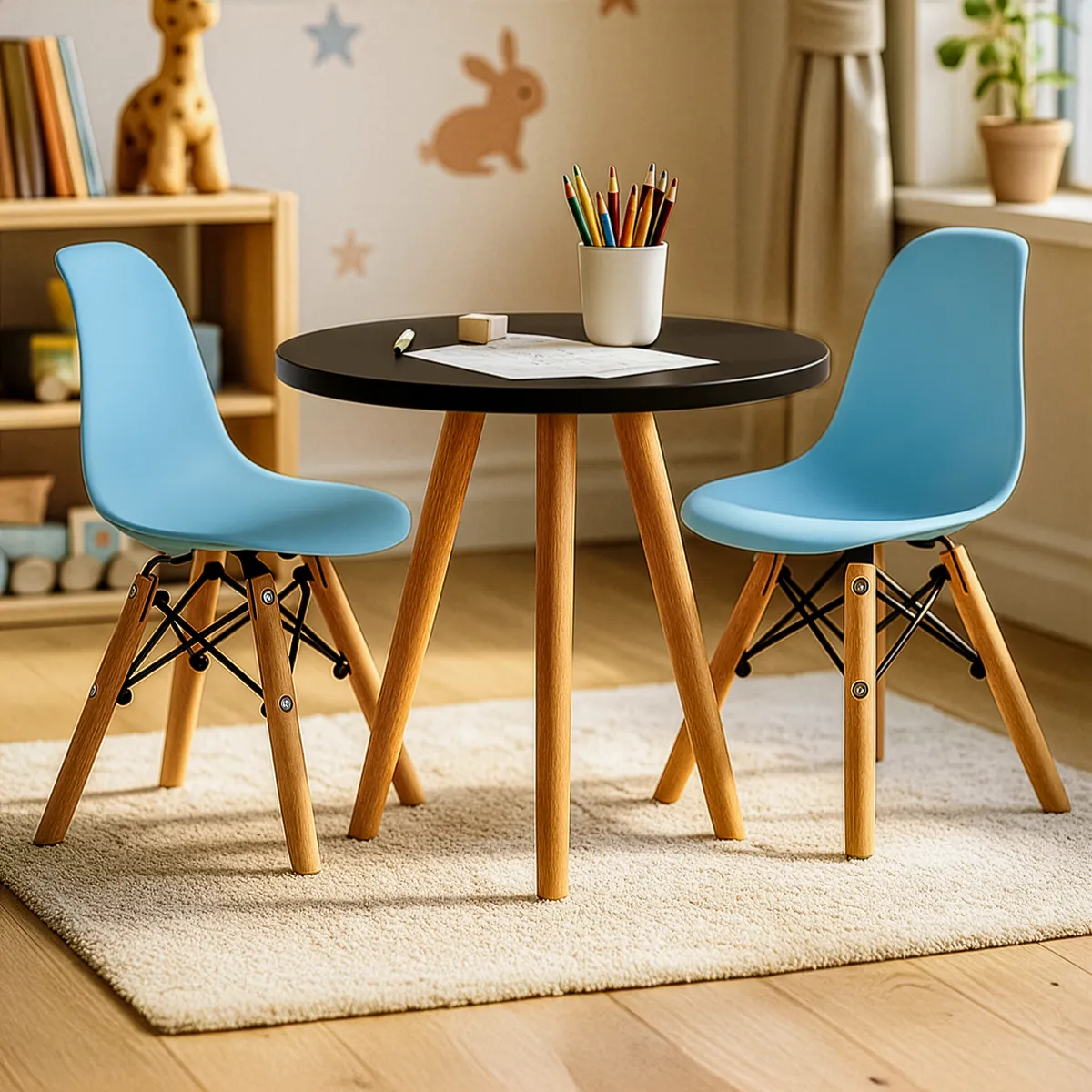 Procurando uma solução funcional e elegante para completar a área de recreação infantil? Não procure mais, nosso incrível pacote inclui uma linda mesa com pernas de madeira envernizada e duas cadeiras infantis Charles Eames.