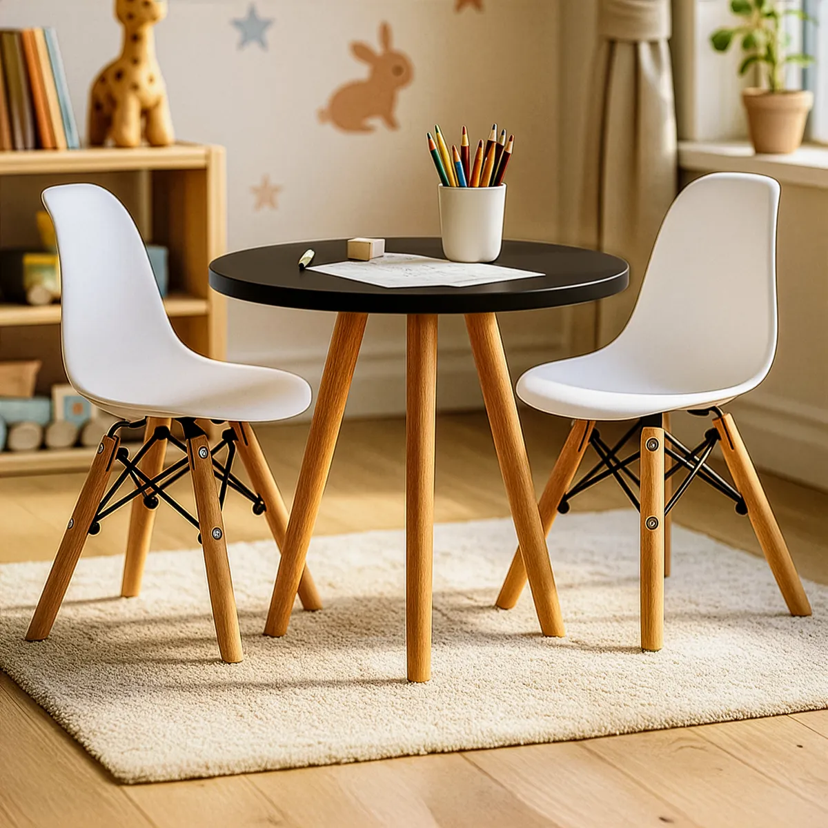 Procurando uma solução funcional e elegante para completar a área de recreação infantil? Não procure mais, nosso incrível pacote inclui uma linda mesa com pernas de madeira envernizada e duas cadeiras infantis Charles Eames.