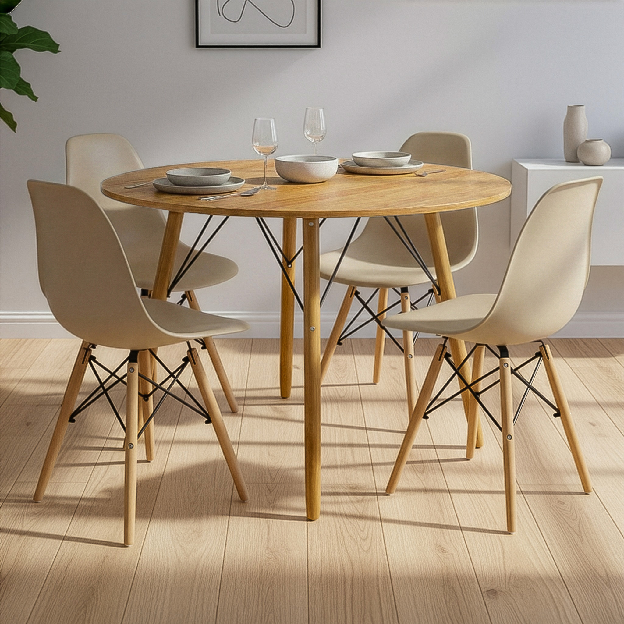 Mesa de Jantar Redonda Eiffel 100cm Louro Freijó com 4 Cadeiras Eames Nude
