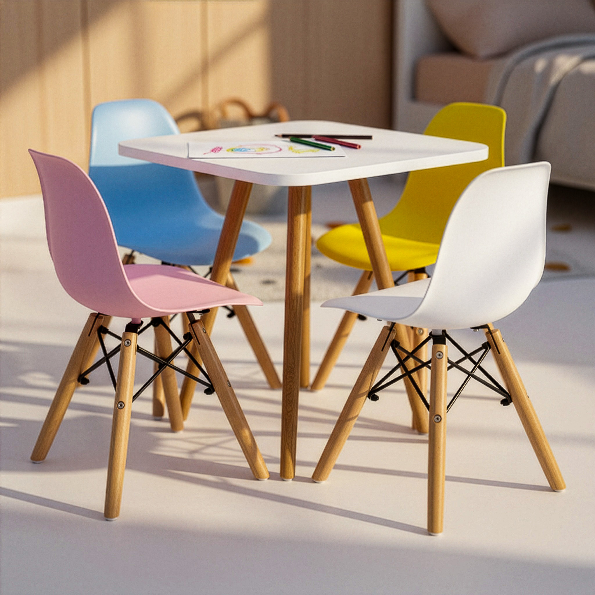 KIT MESA CHARLES EAMES EIFFEL INFANTIL COM QUATRO CADEIRAS EIFFEL PÉS DE MADEIRA!