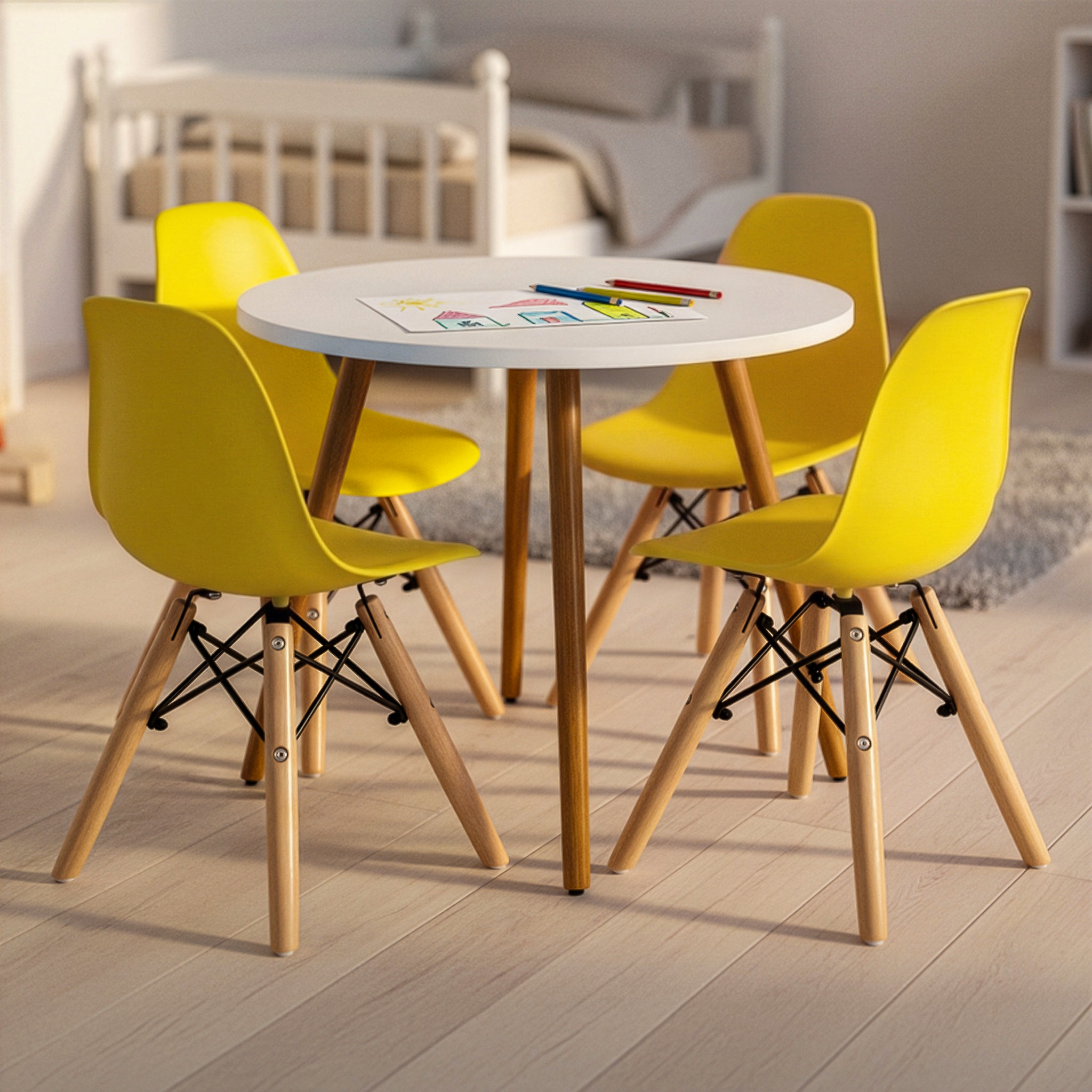 Procurando uma solução funcional e elegante para completar a área de recreação infantil? Não procure mais, nosso incrível pacote inclui uma linda mesa com pernas de madeira envernizada e cadeiras infantis Charles Eames.