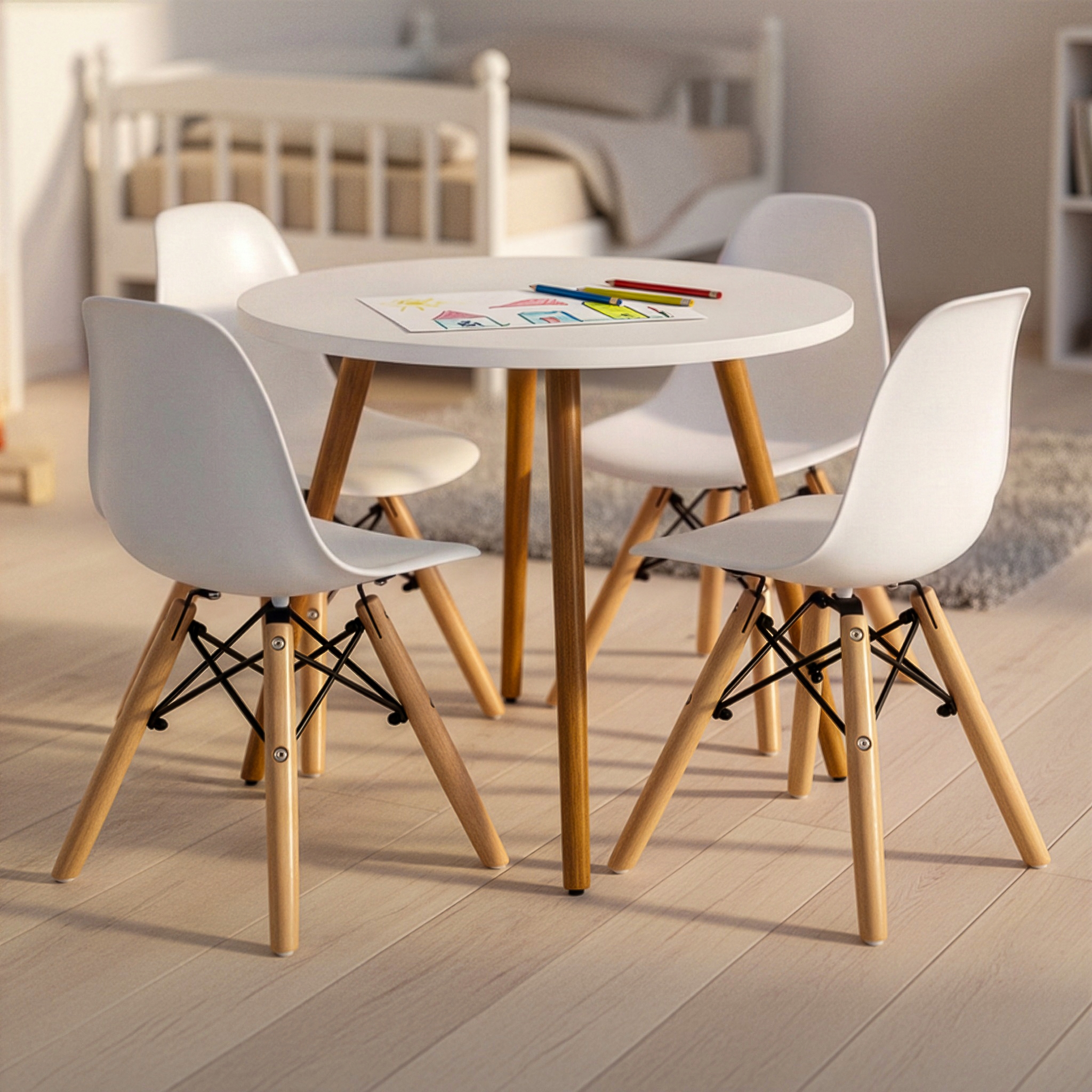 Procurando uma solução funcional e elegante para completar a área de recreação infantil? Não procure mais, nosso incrível pacote inclui uma linda mesa com pernas de madeira envernizada e cadeiras infantis Charles Eames.