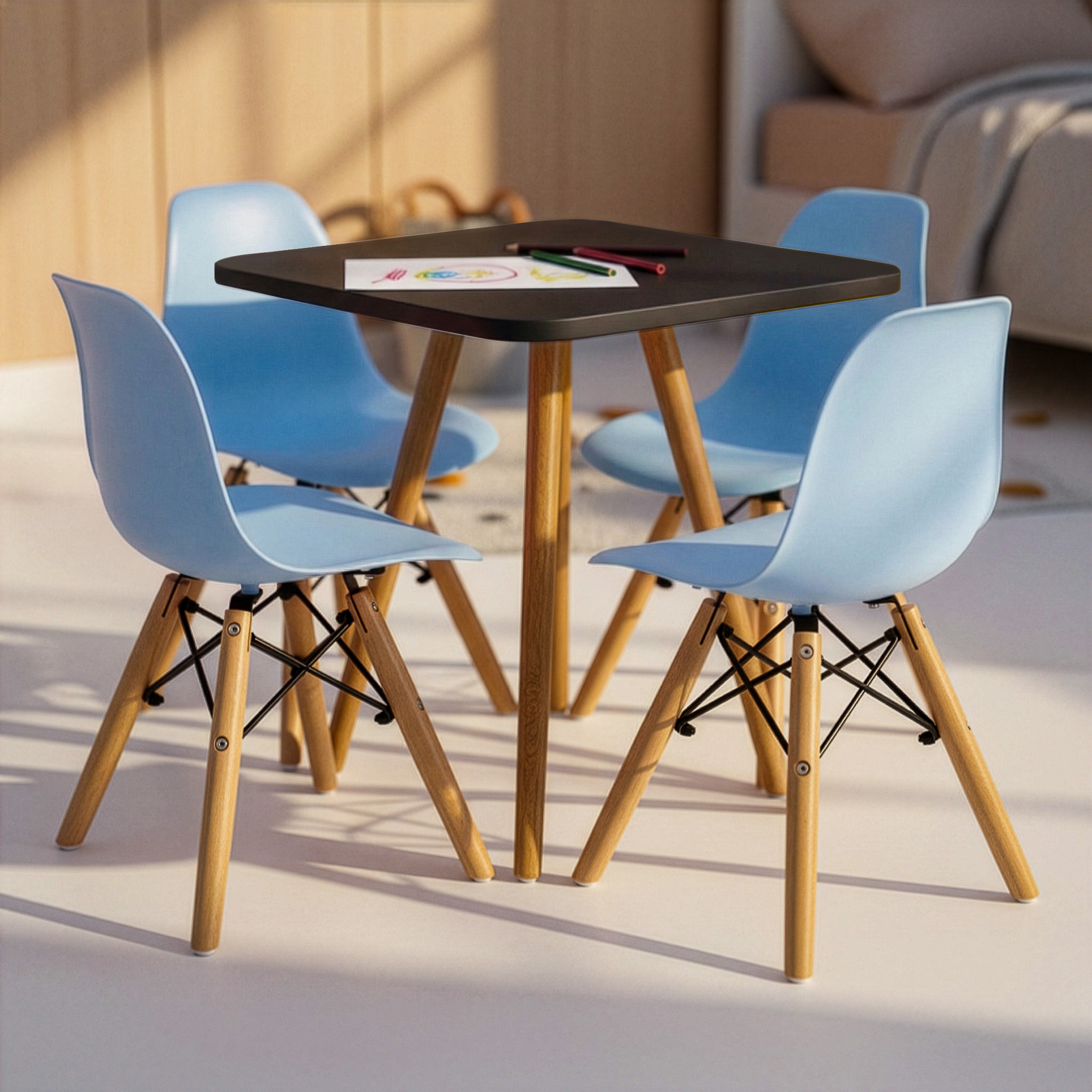 Mesa Infantil Preta 50cm Quadrada + 4 Cadeiras Eiffel Azul