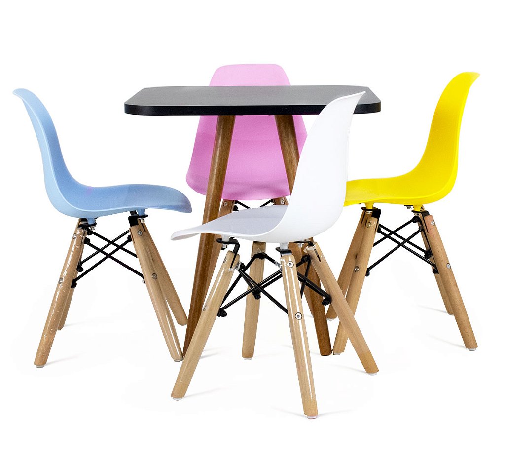 Mesa Infantil Preta 50cm Quadrada + 4 Cadeiras Eiffel Colorido