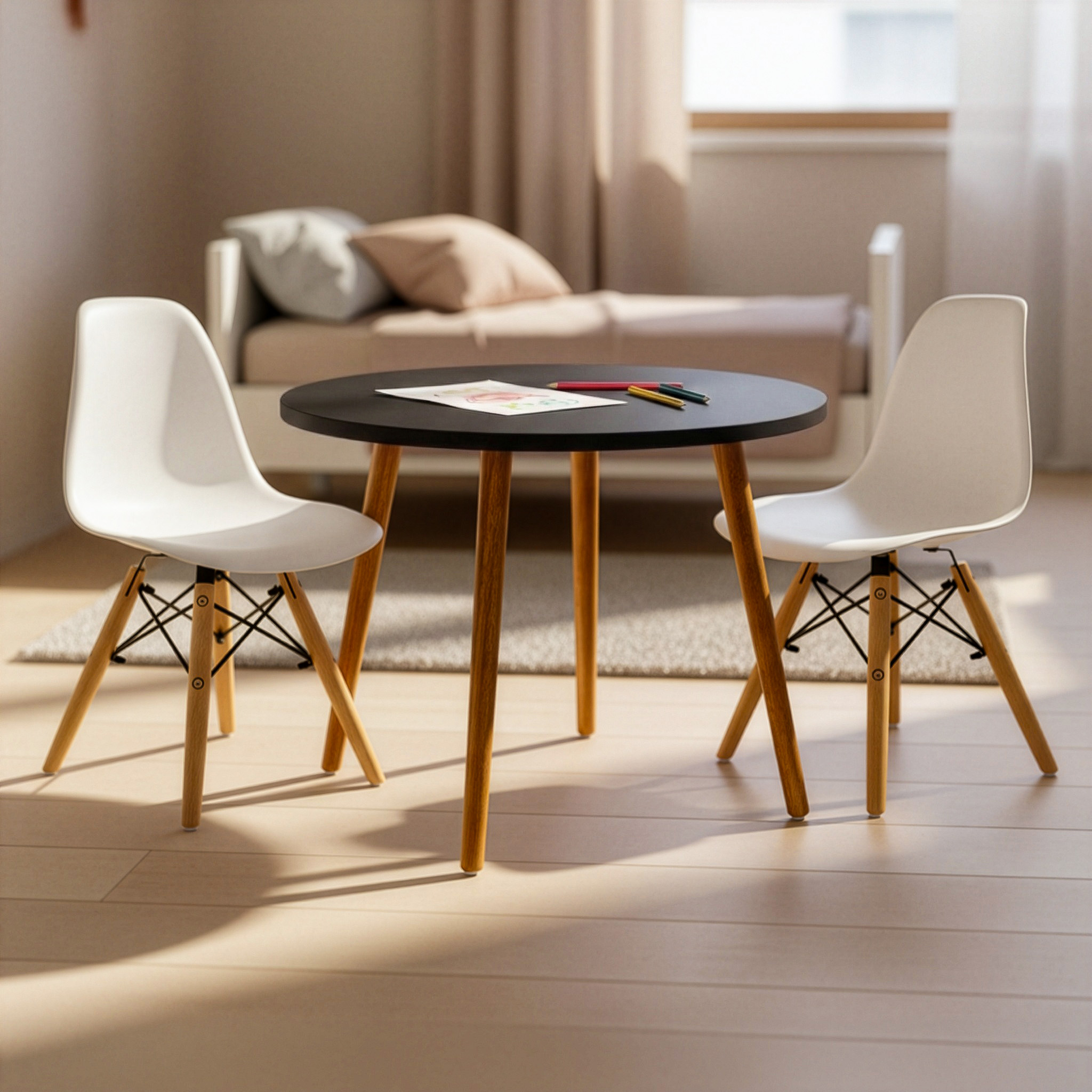 Procurando uma solução funcional e elegante para completar a área de recreação infantil? Não procure mais, nosso incrível pacote inclui uma linda mesa com pernas de madeira envernizada e cadeiras infantis Charles Eames.