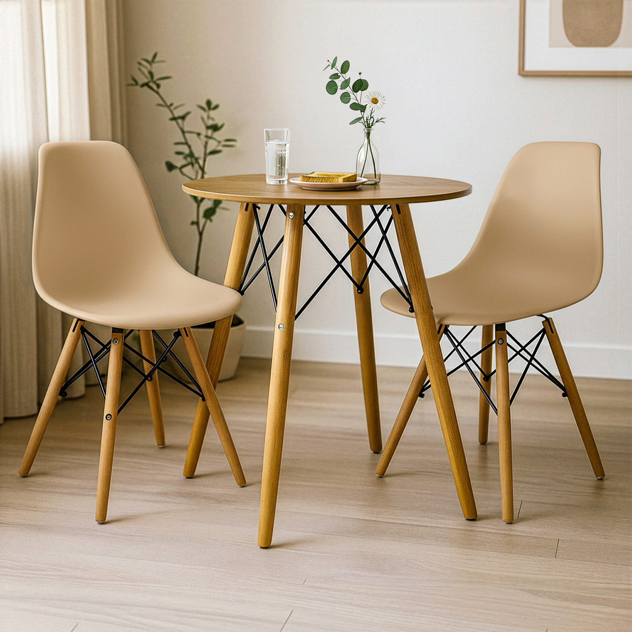 Mesa Redonda Eiffel 60cm Louro Freijó com 2 Cadeiras Eiffel Nude