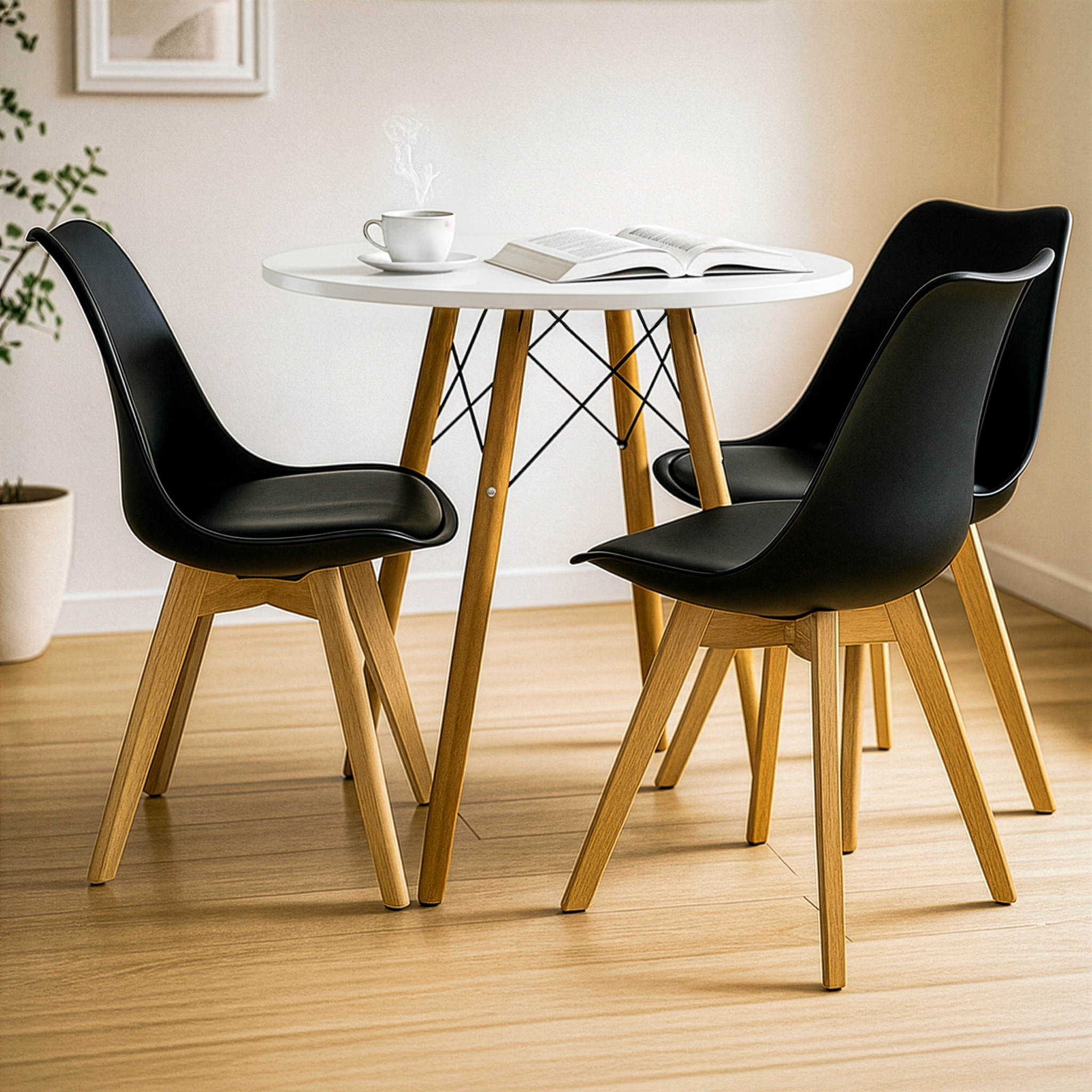 O conjunto Mesa Redonda Eiffel com Cadeiras Leda une design moderno, conforto e resistência, sendo ideal para salas de jantar, cozinhas e espaços gourmet. Um kit funcional e elegante, perfeito para o uso diário.