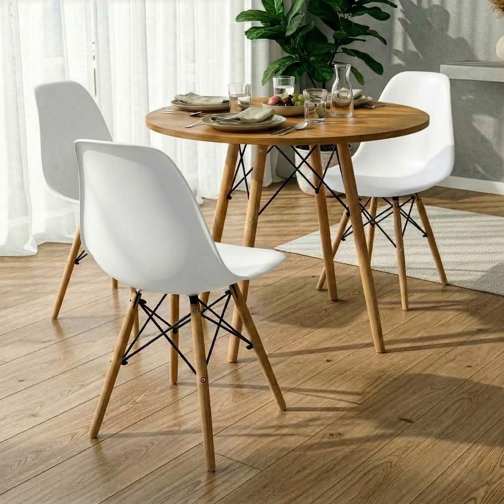 Mesa Redonda Eiffel 70cm Louro Freijó com 3 Cadeiras Eiffel Branca