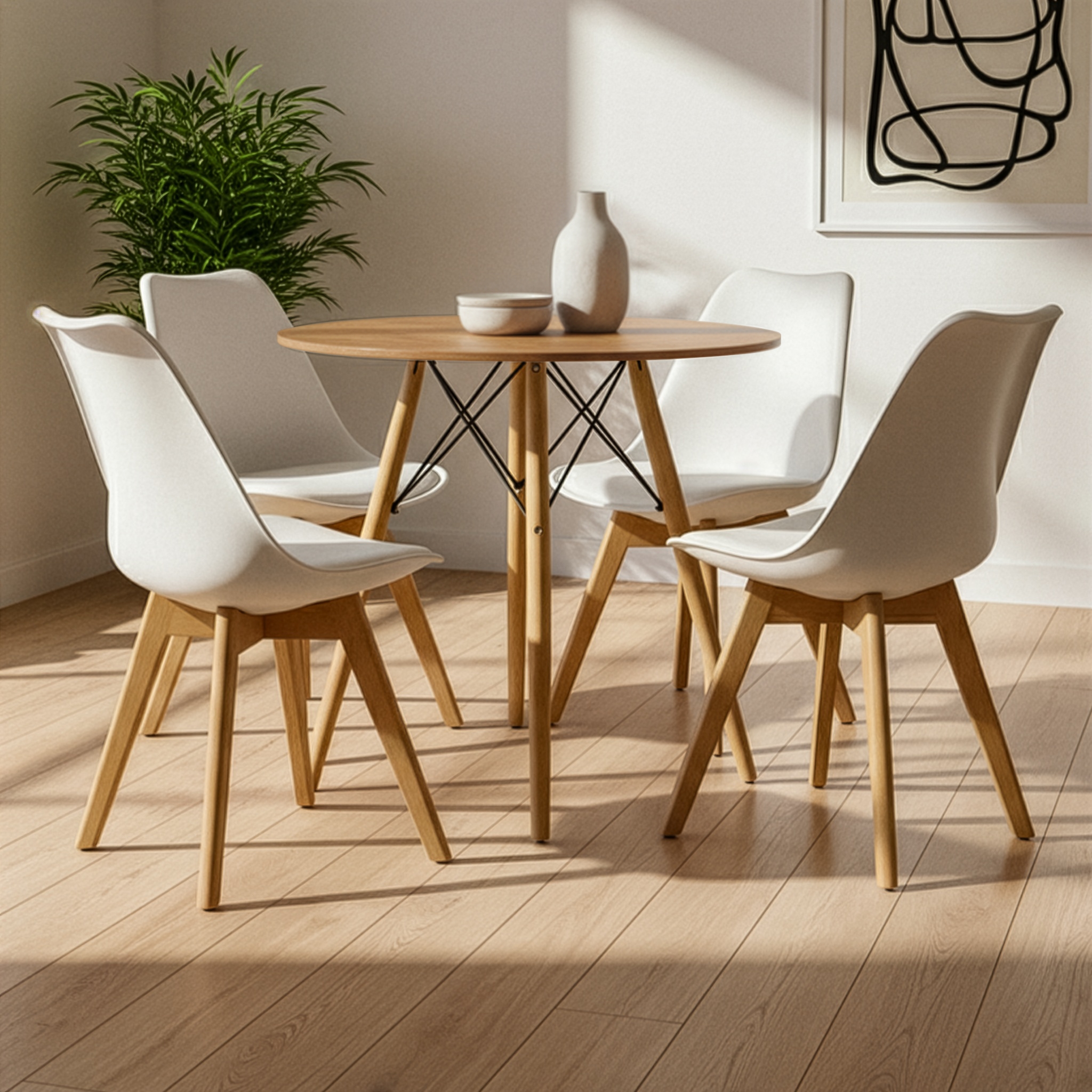 O conjunto Mesa Redonda Eiffel com Cadeiras Charles Eames une design moderno, conforto e resistência, sendo ideal para salas de jantar, cozinhas e espaços gourmet. Um kit funcional e elegante, perfeito para o uso diário.