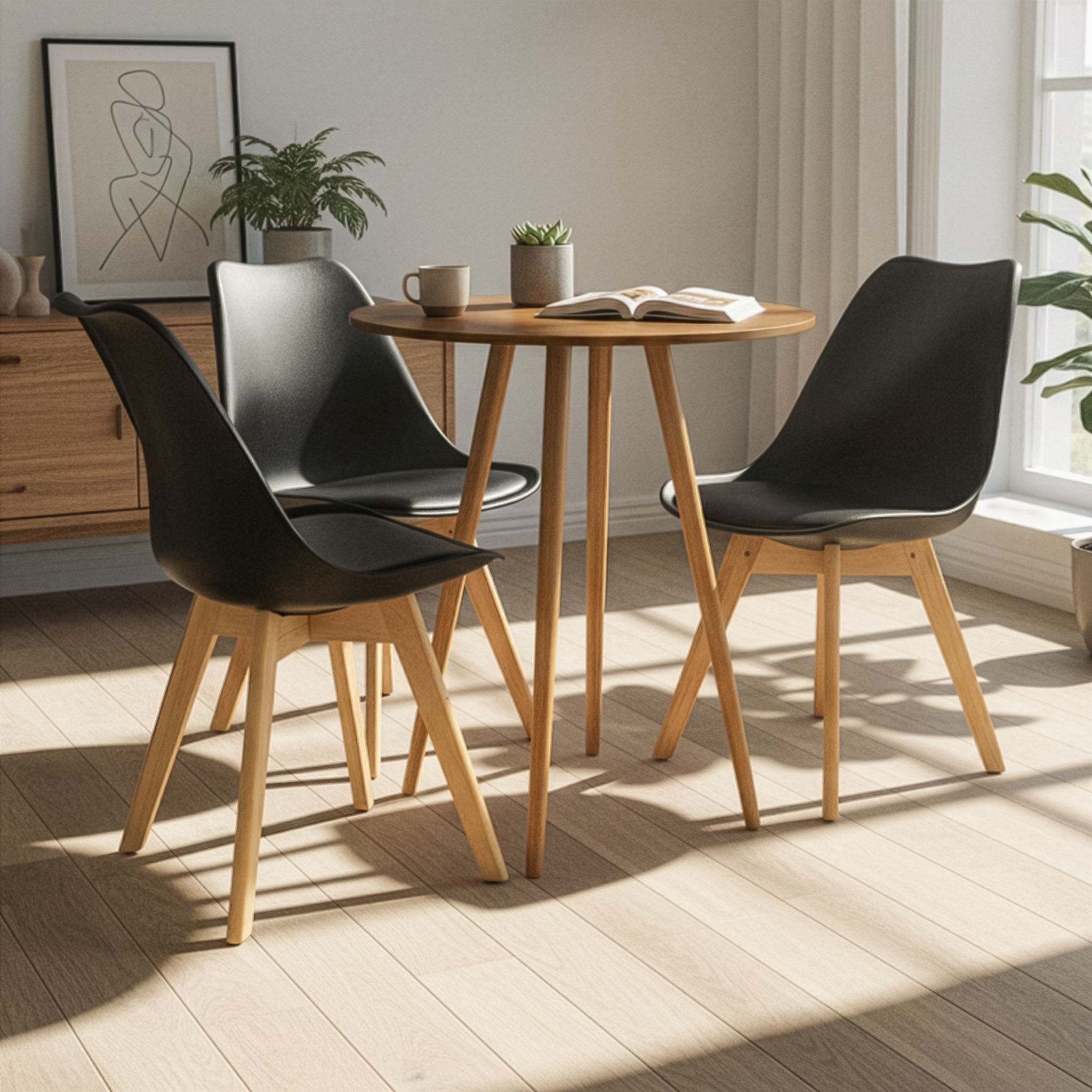 O conjunto Mesa Redonda Sofia com Cadeiras Leda une design moderno, conforto e resistência, sendo ideal para salas de jantar, cozinhas e espaços gourmet. Um kit funcional e elegante, perfeito para o uso diário.