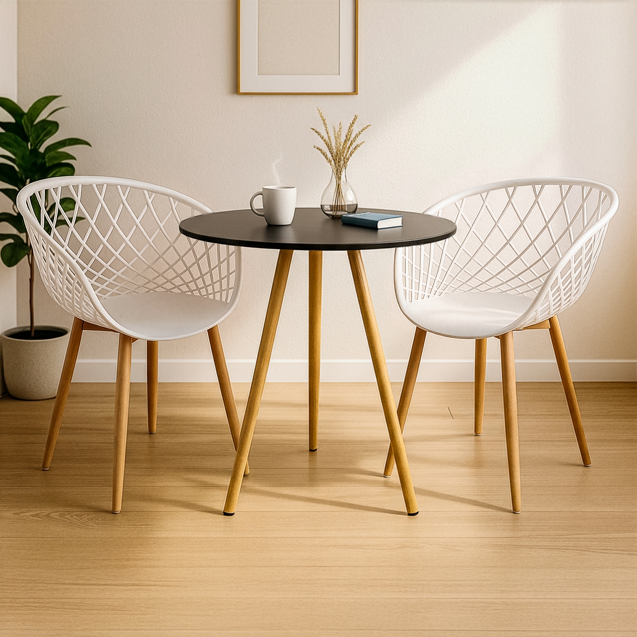 CONJUNTO MESA DE JANTAR REDONDA TRIPÉ PREMIUM 70CM COR PRETO COM 2 CADEIRAS CLARICE COR BRANCA