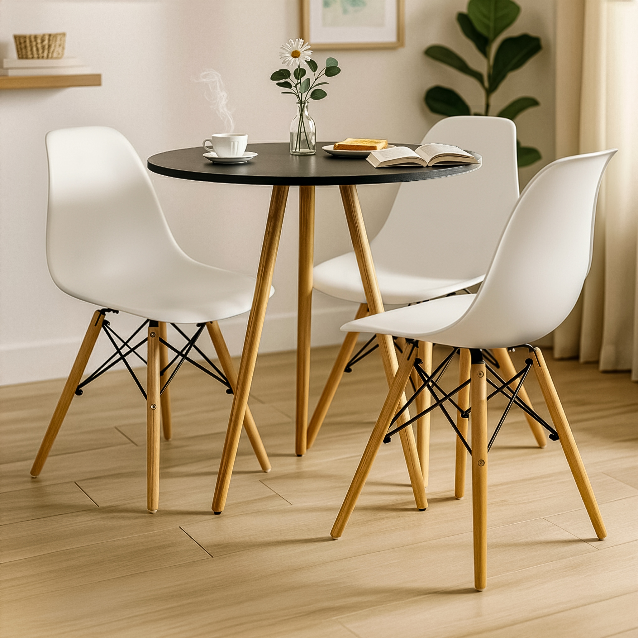 O conjunto Mesa Redonda Tripé com Cadeiras Charles Eames une design moderno e praticidade. Ideal para ambientes compactos, trazendo charme e funcionalidade ao ambiente.