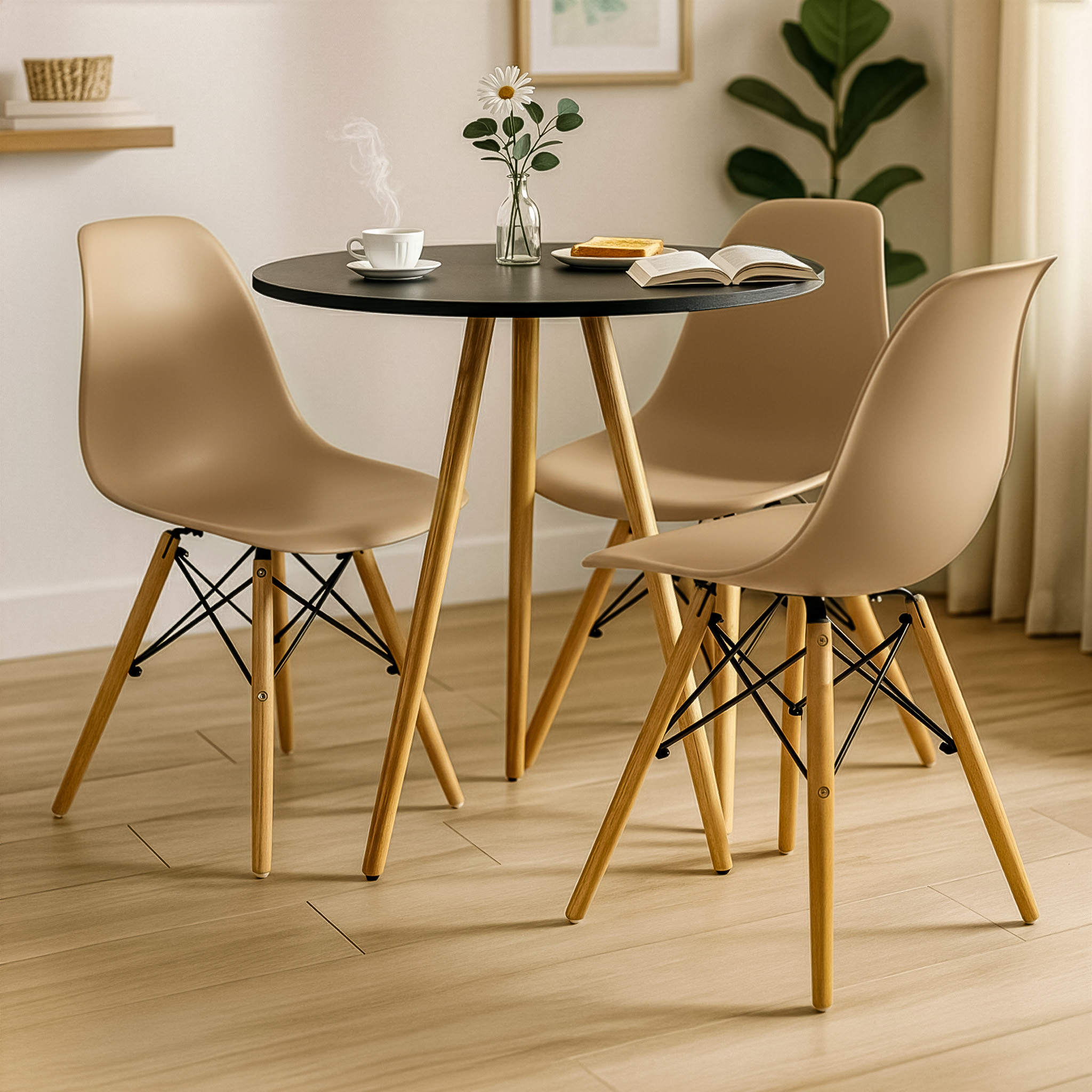 O conjunto Mesa Redonda Tripé com Cadeiras Charles Eames une design moderno e praticidade. Ideal para ambientes compactos, trazendo charme e funcionalidade ao ambiente.