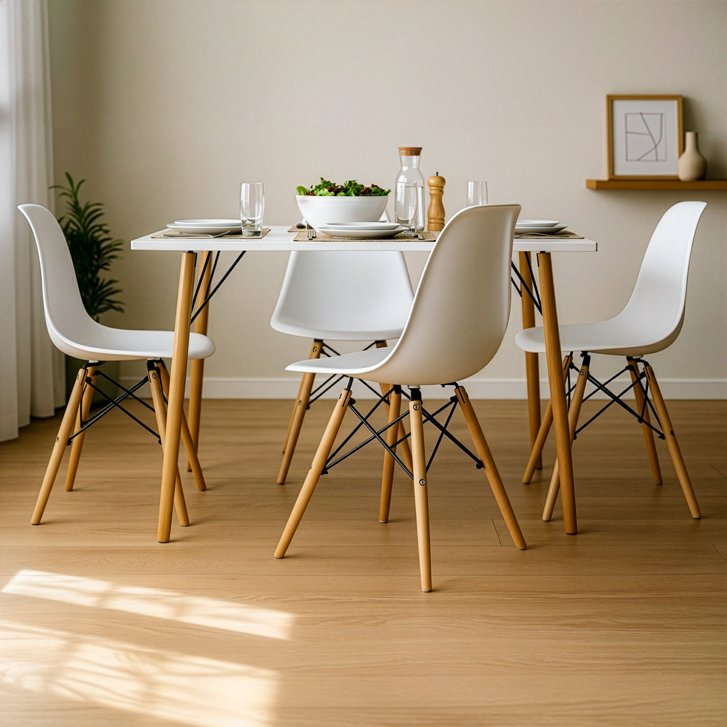 MESA DE JANTAR EAMES EIFFEL RETANGULAR 120X80CM NA COR BRANCA COM CADEIRAS EIFFEL