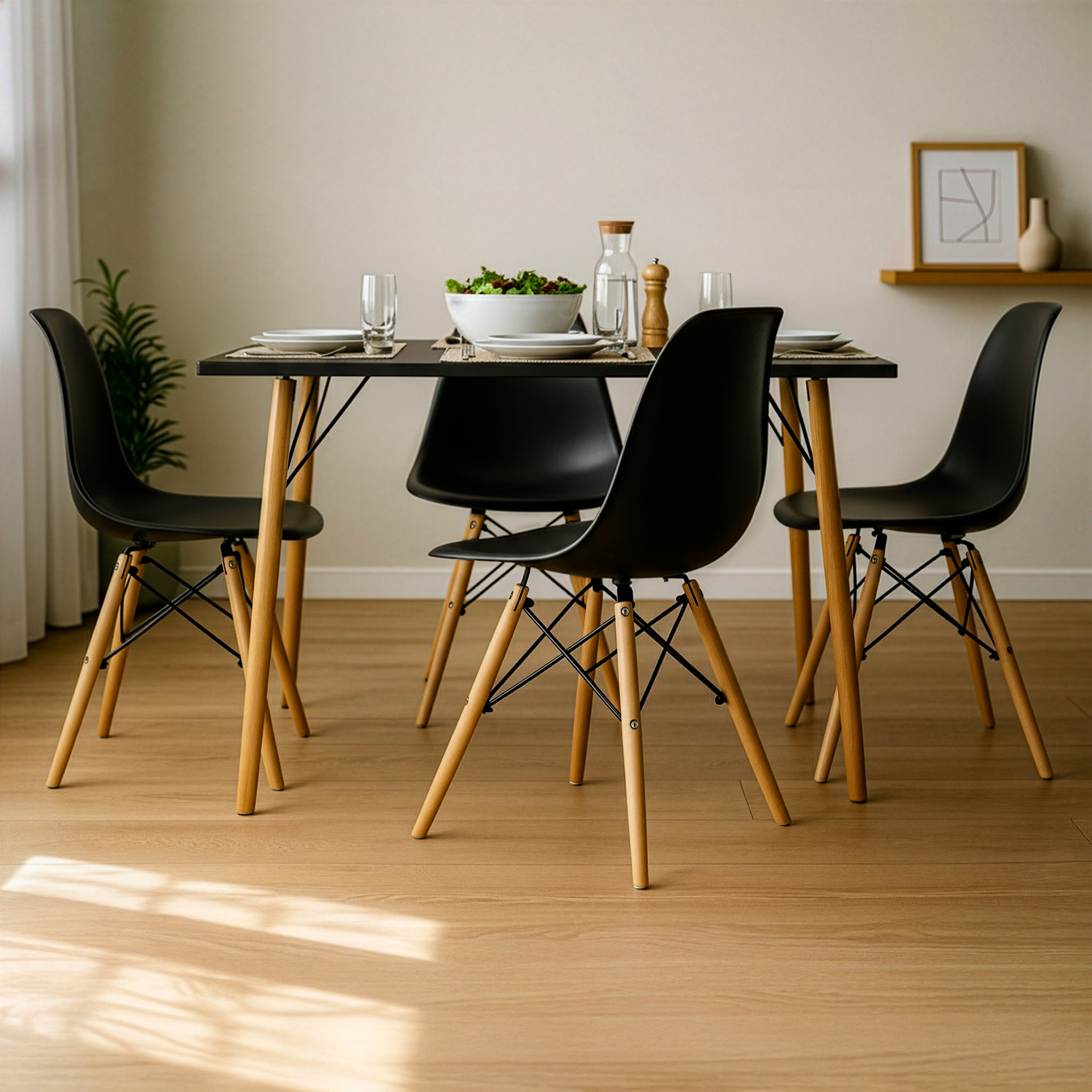 MESA DE JANTAR EAMES EIFFEL RETANGULAR 120X80CM NA COR PRETA COM CADEIRAS EAMES EIFFEL